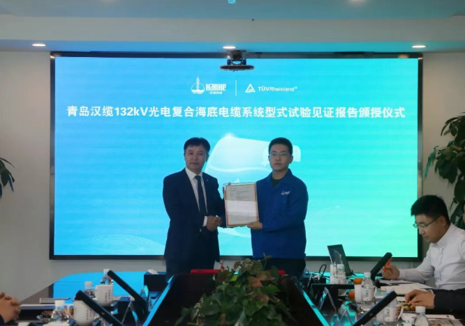 在與會嘉賓的共同見證下,TÜV萊茵青島公司執(zhí)行董事王會波向漢纜股份代表頒發(fā)了《132kV光電復(fù)合海底電纜系統(tǒng)型式試驗見證報告》。緊接著,漢纜股份董事長張立剛與TÜV萊茵青島公司執(zhí)行董事王會波共同簽署了《出海戰(zhàn)略合作框架協(xié)議》。